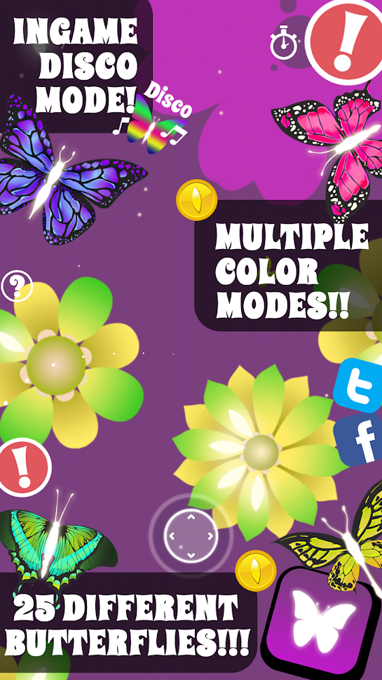 Choose a butterfly and fly over the colorful world collecting pollen, but watch out for the other bugs! See how long you can survive and how many butterflies you can unlock. Each Butterfly is linked to one of of five colorful styles so be sure to select the best one for you! Disco Mode adds a new dynamic where all the colors are constantly changing so if you do decide to unlock it, be prepared as it is very distracting!